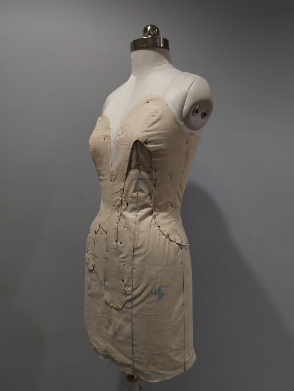 - 3D Manipulation: Moving beyond standard patterns, the class practiced pinning, tucking, and pleating directly onto the dress form to create organic, avant-garde shapes.